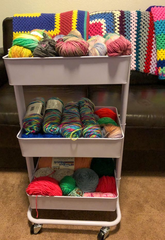 It’s pretty appropriate that a few of my crocheted blankets are in the background. I feel like this yarn is a lot easier to get to, which is always a plus, and I feel more motivated to use it now that I can actually see it! My goal is to eventually use enough yarn to not need a cart, 3 different bags, a cloth storage bin, and like, 5 different bags. I have to say that I’m actually doing pretty good with buying no or very little yarn. It’s just a matter of actually using it.