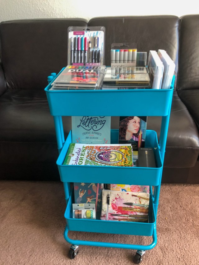 I swear, every time I go to Michael’s now, I spend as much time looking at pens, markers and notebooks as I do yarn. I have a rolling cart that has been assembled, and it’s been nice to have my pens, journals, notebooks and coloring books in one place instead of scattered around my apartment. It’s a lot more organized, and it’s easier to get what I need. Between that, and the tv tray I got a while ago, I finally have a small but portable work station!